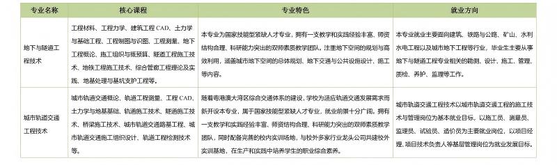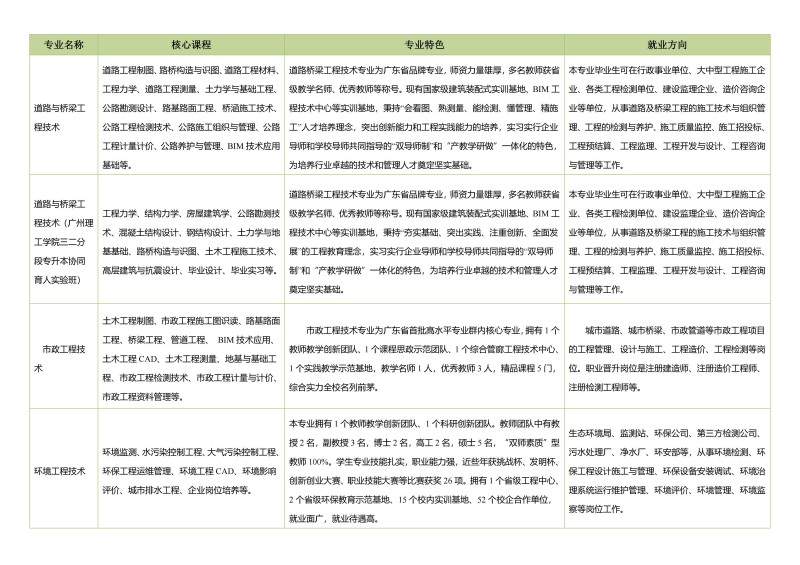 市政与交通学院目前开设有道路与桥梁工程技术、市政工程技术、环境工程技术、地下与隧道工程技术、城市轨道交通工程技术等5个专业,其中道路桥梁工程技术、市政工程技术专业为广东首批省高职院校高水平专业群的核心专业,学院师资力量雄厚,硕士以上教师达90%,副教授以上职称教师达50%,双师素质教师超80%,团队成员教科研能力强,综合素质较高,国家科技进步二等奖1项,省级二等奖1项,广东省科学技术奖三等奖1项,市级科学技术进步奖二等奖2项,三等奖2项,省级品牌专业1个,3个国家级与省级实训基地。与100多家企业长期保持实习就业合作、共建校外产学研合作基地。与广东安都建设集团、广州万维视景科技有限公司、清远市生态环境局等单位联合建设“广建-安都造价实战实训基地”、“路桥工程虚拟现实仿真(VR)开发双创中心”、“生态环境一基地四平台”等校内实训基地。